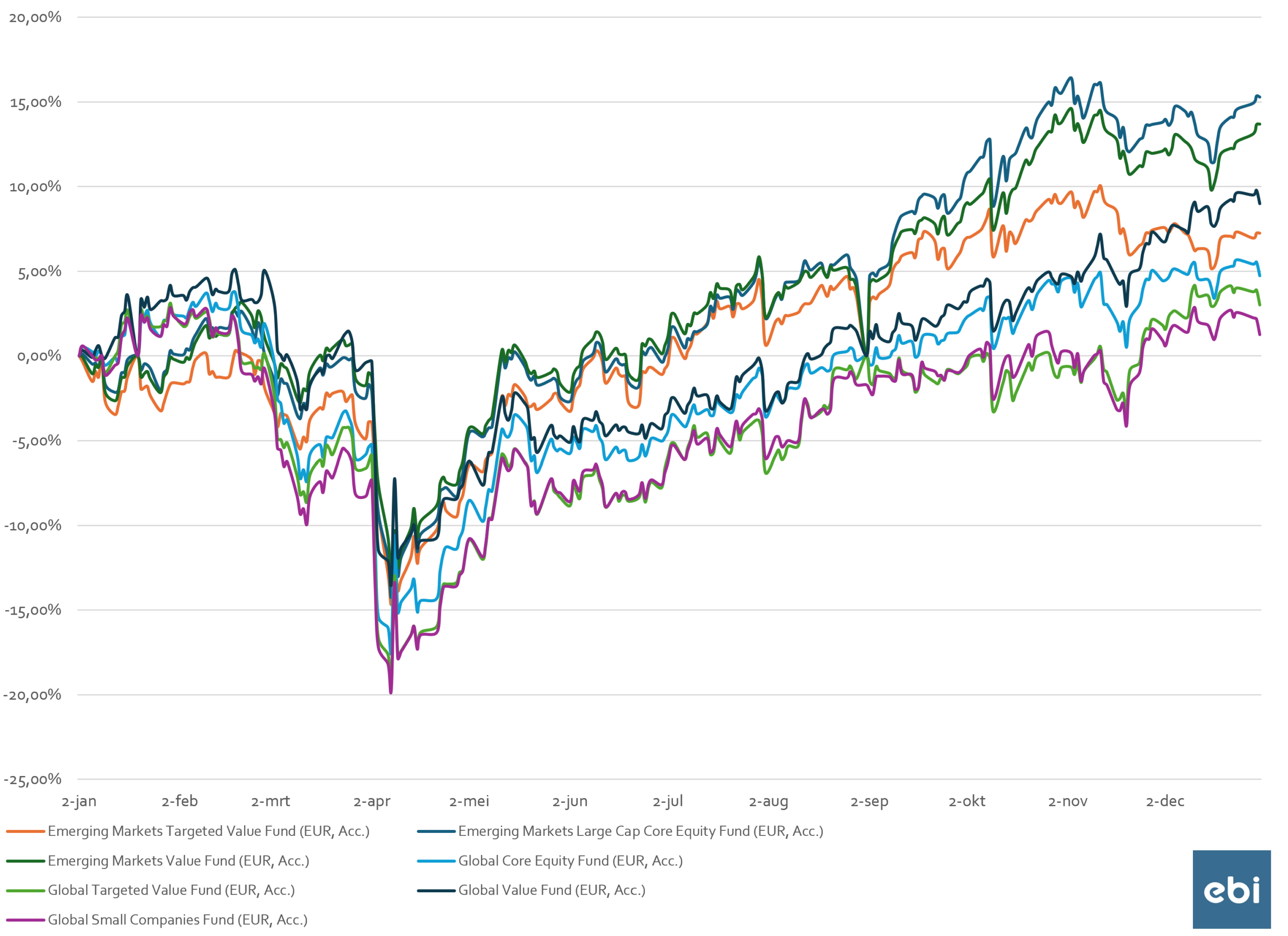 Hieronder zie je de ontwikkeling van de belangrijkste fondsen die wij gebruiken in onze modelportefeuilles.